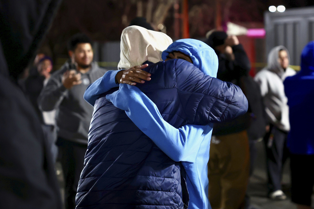 People hug each other after a fatal shooting in a parking lot of The Church of Jesus Christ of Latter-day Saints in Salt Lake City on Wednesday, Jan. 7, 2026. (Laura Seitz/The Deseret News via AP)