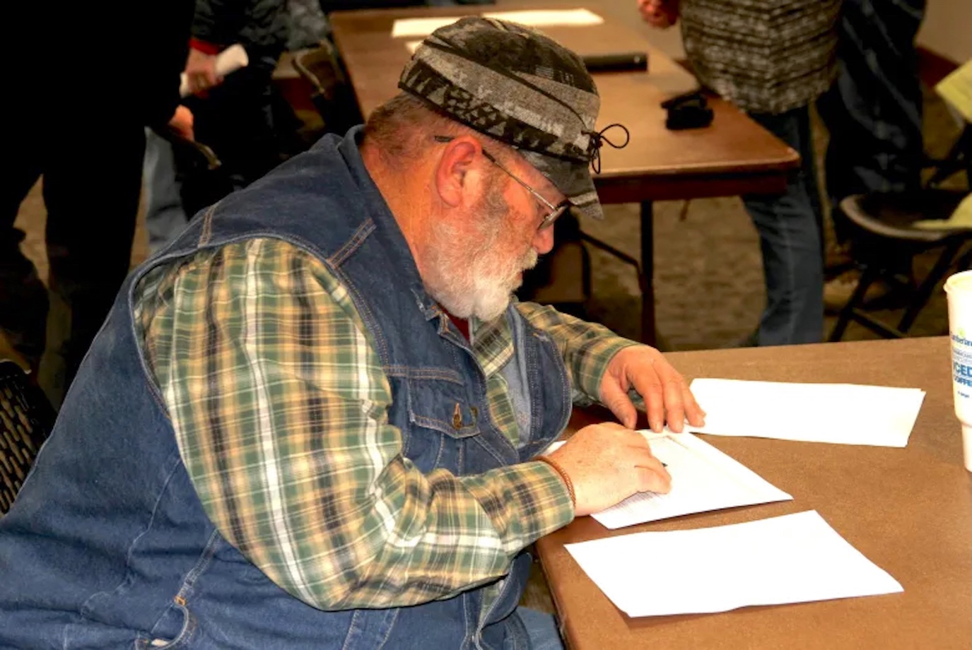 Glenn Lehar, a retired Jim Bridger Power Plant mechanic, fills out a comment form at a December 2025 Bureau of Land Management meeting about plans for the Rock Springs Field Office. (Mike Koshmrl/WyoFile)
