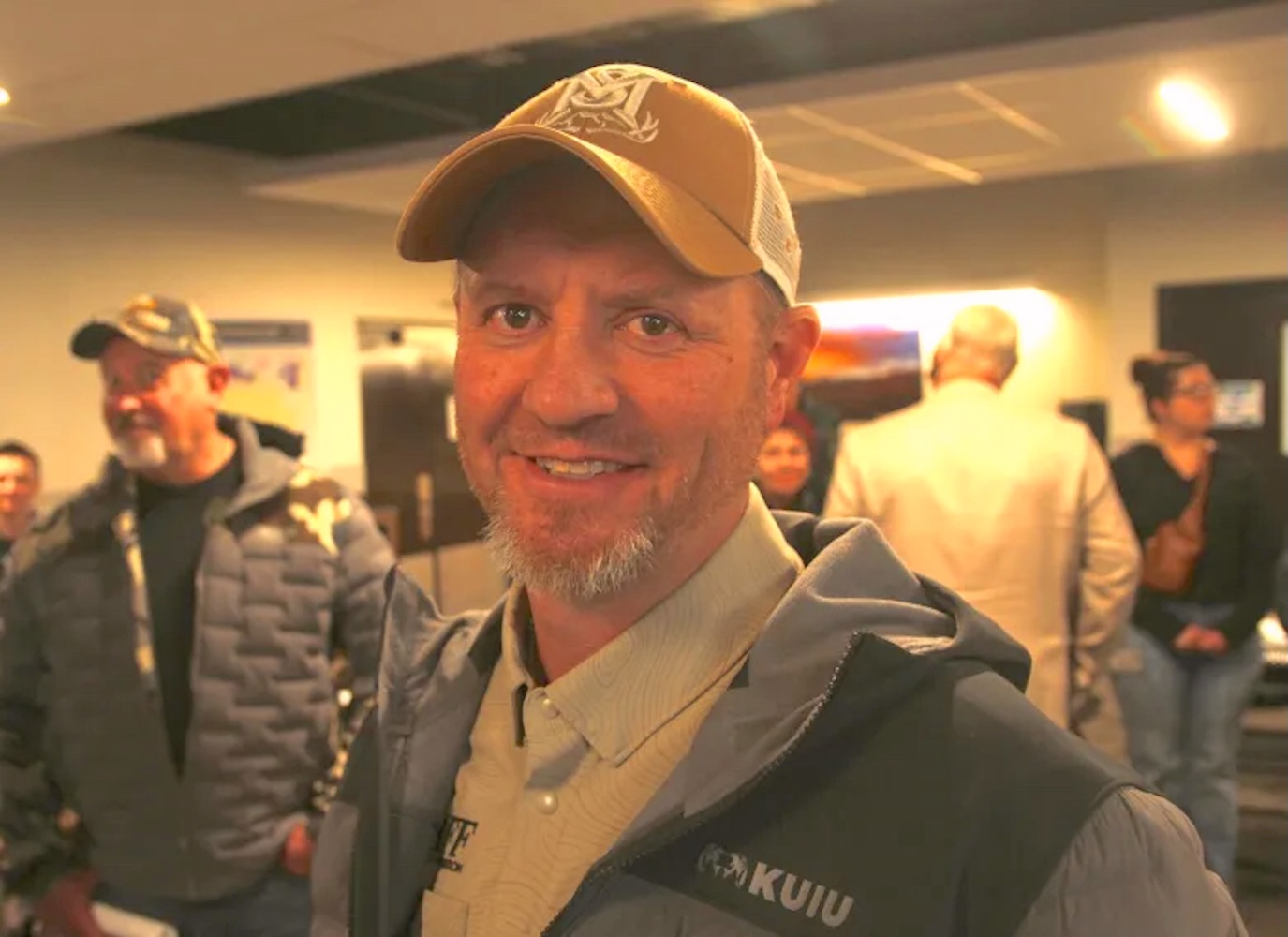 Joey Faigl, president of the Muley Fanatics Foundation, at a December 2025 meeting in Rock Springs. (Mike Koshmrl/WyoFile)