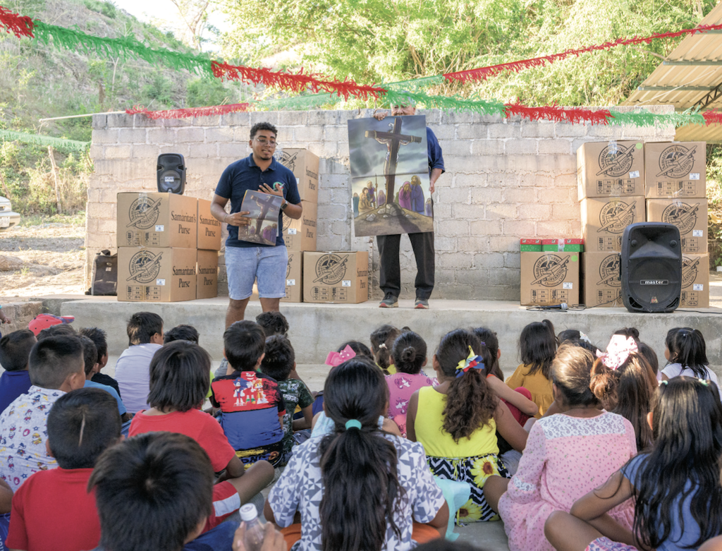A ministry partner tells children in Mexico about Jesus’ death on a cross using colorful posters from Samaritan’s Purse. PHOTO/SAMARITAN’S PURSE