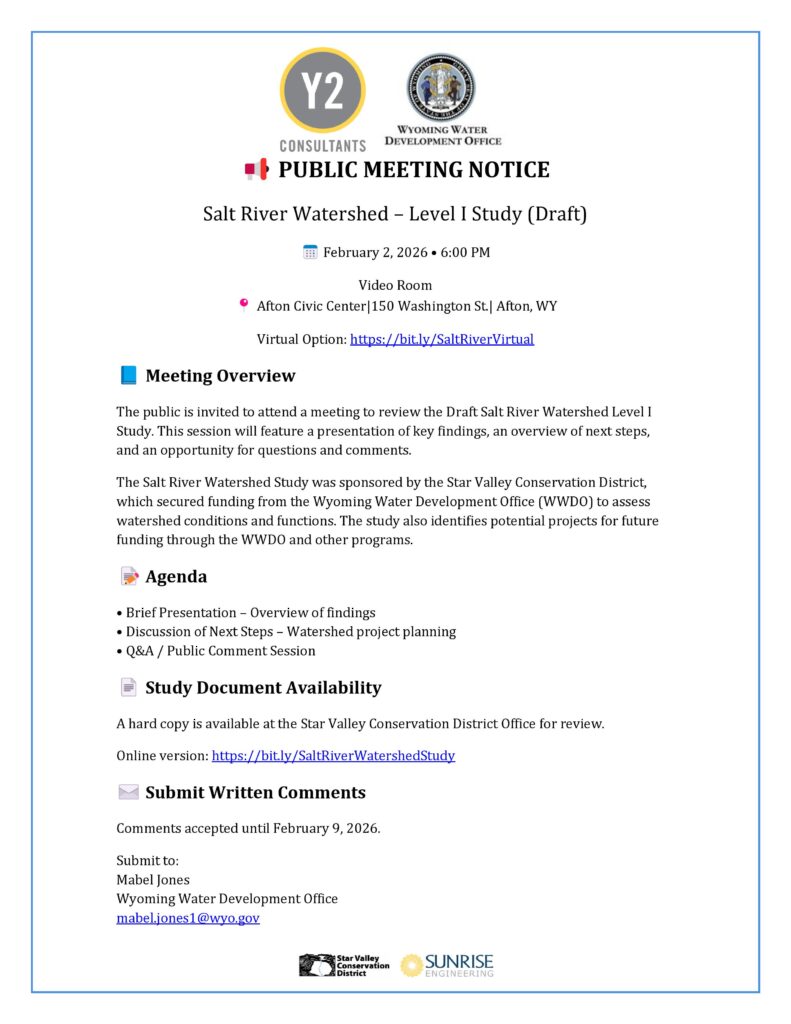 (3:01) So that document is available online, as well as there’s a copy at the Star Valley Conservation District Office, if anyone wants to take a look at that prior to the meeting. (3:12) And we’ll be there to answer any questions or make sure there wasn’t anything, you know, we didn’t capture in that. (3:17) But we’re really looking forward to sharing the findings and showing the neat projects that we’re going to have moving forward with the Conservation District.