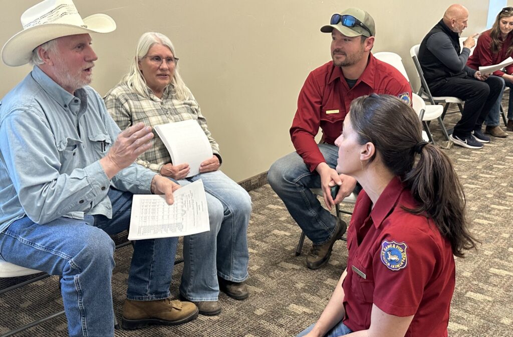 Cheyenne Stewart (bottom right) speaks with residents during the Season Setting meeting held in Thayne. SVI photo/Dan Dockstader